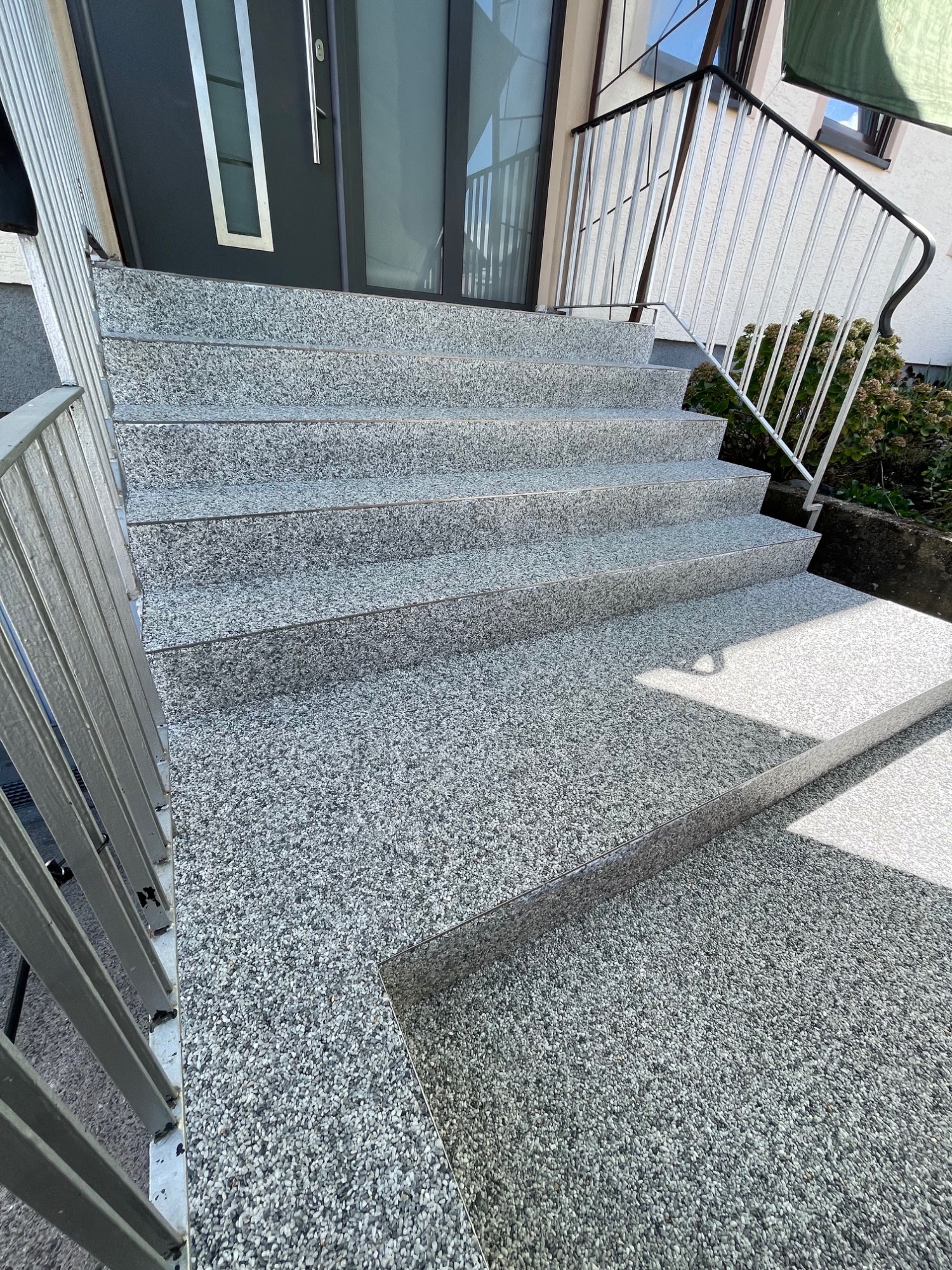 Kellertreppenaufgang mit Steinteppich in Betongrau und Edelstahlschienen